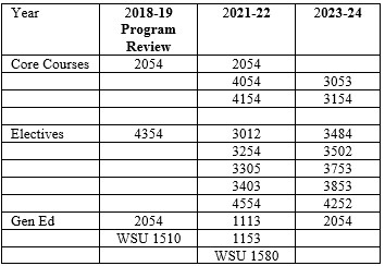 Going forward (beginning Fall 2023) we will use an outcome-based assessment based on the new program learning outcomes. Each outcome will be assessed in the courses indicated in the grid using one or more assignments and reported by the faculty to the department chair. Assessment outcomes will be reported to the department in an annual spring department meeting. Outcomes from assessments will be compiled for the biennial assessment report.